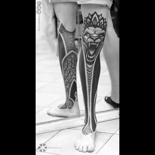 Татуировки в геометрическом стиле на ноге мужчины используют геометрические формы и узоры для создания уникальных и абстрактных дизайнов. Они могут быть симметричными или асимметричными, и включать различные геометрические фигуры.