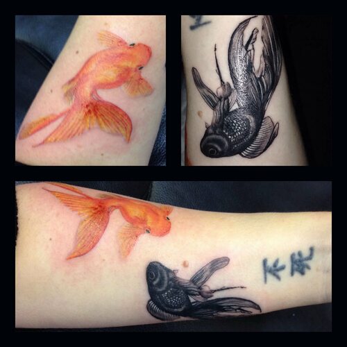 Татуировка рыбы в традиционном японском стиле, также известная как иро-мобори, представляет собой яркое и выразительное изображение рыбы с использованием японских мотивов, таких как волны или цветы. Этот стиль обычно включает большие, детализированные композиции, созданные с помощью ярких цветов и сильных контуров.
