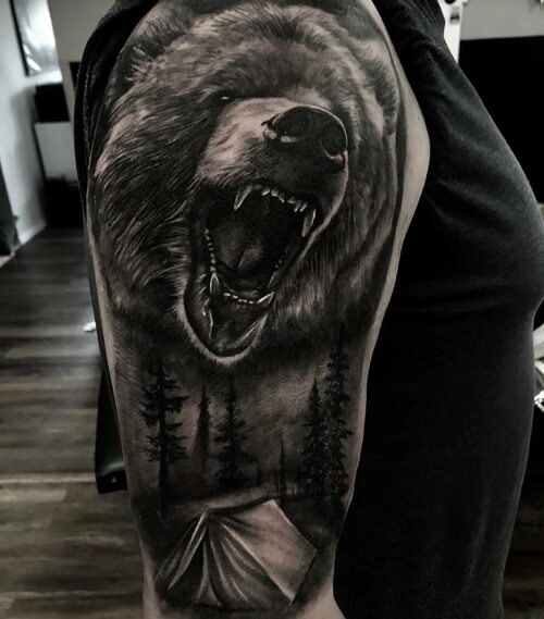 Реалистичная татуировка медведя на плече может быть поразительно красивой и впечатляющей. Вы можете выбрать изображение медведя, выполненное в высоком разрешении с множеством деталей. Этот стиль подойдет тем, кто хочет, чтобы их татуировка выглядела как настоящий медведь, который просто вышел из леса.
