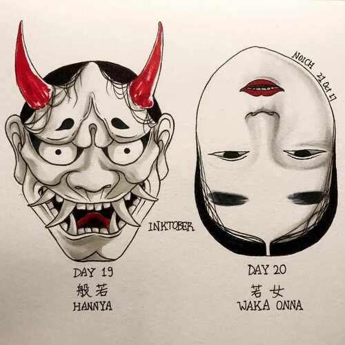 Онна Бугё, или "женская маска", изображает молодую женщину с тонкими чертами лица и рассеянным взглядом. Эта маска является символом молодости, красоты и нежности, и часто используется в татуировках для выражения женственности и элегантности.