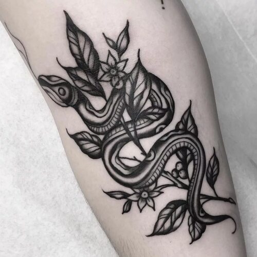 Эта татуировка представляет собой стилизованную ветку с змеей в графическом стиле. Простота и элегантность делают ее особенной и запоминающейся.