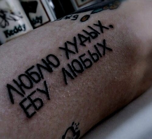 Другая татуировка, символизирующая мои ценности, на моей руке - это цитата известного философа о любви и сострадании. Эта татуировка напоминает мне о важности любви к ближнему и о том, что мы должны всегда проявлять сострадание к другим людям.