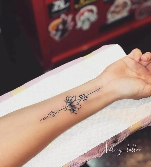 Лотос, прекрасный и изящный цветок, имеет особое значение в разных культурах. Он ассоциируется с чистотой, преображением и духовным ростом. Такое татуировочное изображение на руке девушки добавляет ей загадочности и элегантности, подчеркивая ее нежность и внутреннюю силу.