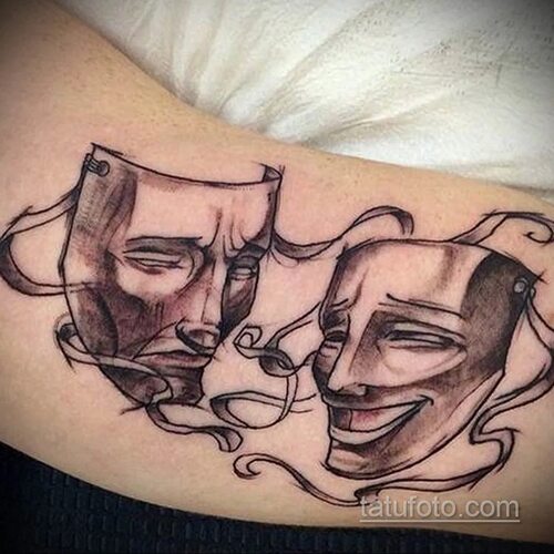 Две маски, одна веселая и другая грустная, в татуировках могут иметь различные значения, в зависимости от того, как их интерпретирует каждый человек. Для некоторых людей эти маски символизируют две стороны их собственной личности - радость и грусть. Другие видят в них дуальность жизни, где веселая маска представляет радость, а грустная - горе или печаль. Еще одним возможным значением может быть идея маскировки своих истинных эмоций или скрытых чувств, которые могут быть противоположными внешнему облику.