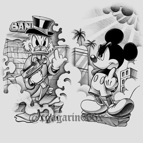 Использование мотивов долларов в татуировках стало очень популярным в последнее время. Доллары - символ богатства, успеха и материального благополучия. Многие люди хотят подчеркнуть свою финансовую независимость и амбиции через татуировки с изображением денежных знаков. Комбинирование мотивов Микки Мауса и долларов в татуировке создает уникальный и стильный образ, который притягивает внимание и вызывает улыбку.