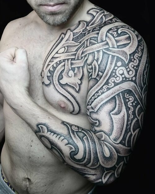 Один из самых популярных вариантов мужских татуировок на плече в кельтском стиле - это кельтский узор. Он может представлять собой сложные плетения, связанные символы или абстрактные формы, которые создают уникальный и запоминающийся образ.