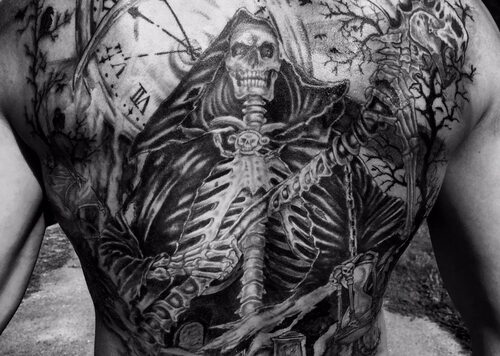 Татуировка смерти с косой на спине имеет глубокую историю и символическое значение. Смерть с косой является архетипическим образом, символизирующим конец жизни и переход в другой мир. Этот мотив может быть воплощением меланхолии, мистики, смерти и трансценденции.