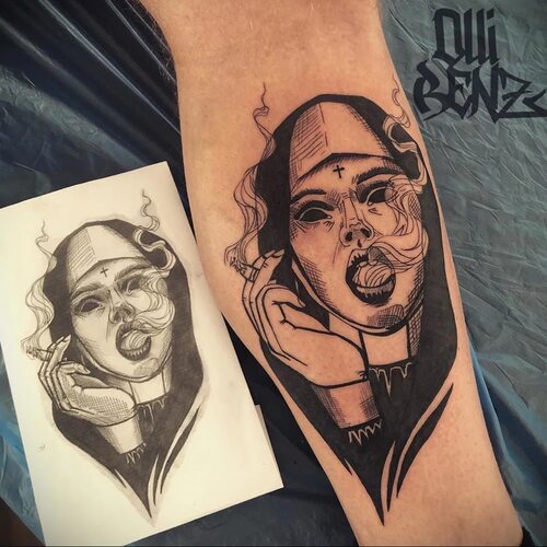 Другая вариация этого мотива включает в себя более абстрактные элементы и играет на контрасте между светом и тенью. Монашка на этой татуировке изображена с выпученными глазами и хитроумной улыбкой, а сигарета является яркой деталью, привлекающей внимание.