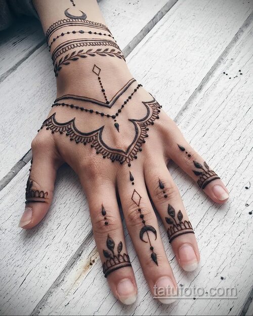 Татуировки хной часто имеют сложные и красивые узоры, которые выглядят очень элегантно на коже. Они могут быть выполнены в различных стилях, от традиционных индийских и арабских узоров до современных абстракций и геометрических фигур.