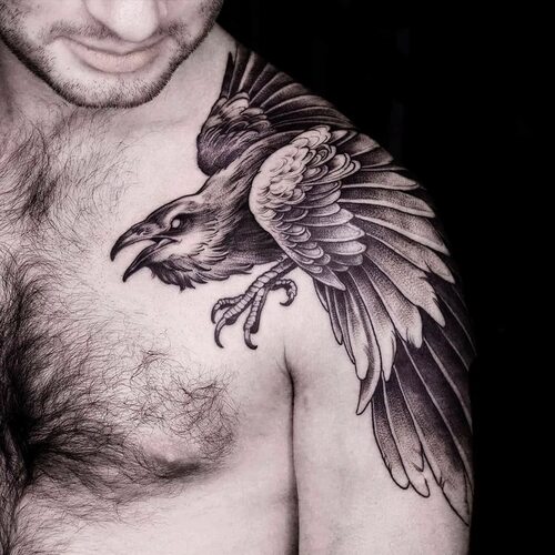 Различные вариации татуировок в виде ворона на плече