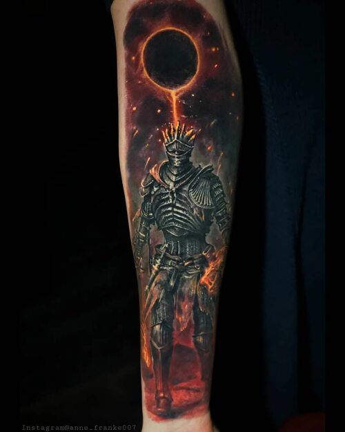 Dark Souls - это серия популярных видеоигр, известных своим мрачным фэнтезийным миром, сложным геймплеем и уникальной атмосферой. Множество поклонников по всему миру не только наслаждаются игрой, но и решают запечатлеть ее на своей коже в виде татуировок.