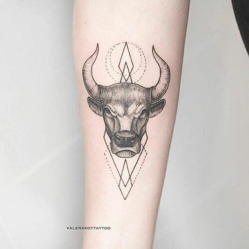Это классический вариант, который возможно выполнить с большим количеством деталей и теней, чтобы создать впечатляющий реалистичный эффект. В такой татуировке вы сможете передать силу и энергию тельца с помощью живописного изображения.