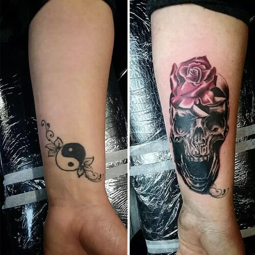 Фотография показывает процесс перебивания татуировки на руке. Старая татуировка представляет собой черно-белый рисунок, который перебит яркими цветами и детализированными элементами. Новая татуировка обладает большей глубиной и выразительностью, полностью скрывая предыдущую татуировку.