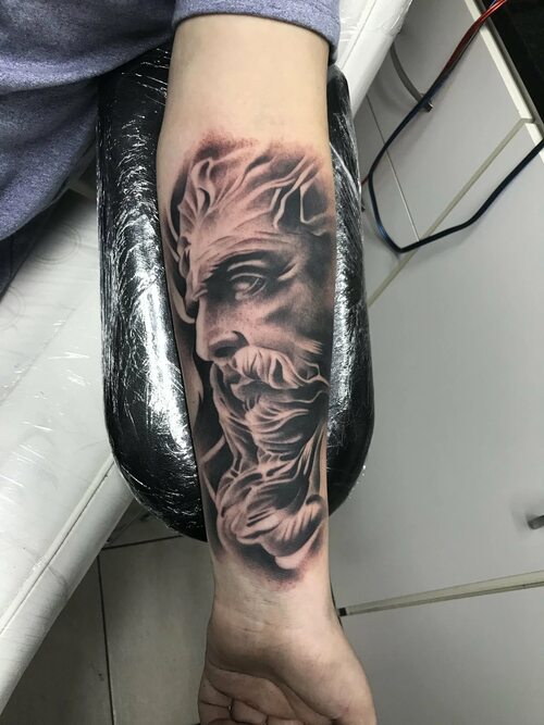 Реалистичный стиль татуировки Зевса на руке подразумевает детальное изображение бога с использованием техники теней, светотени и проработки мелких деталей. Этот стиль позволяет передать величие и мощь Зевса, создавая реалистичный портрет на вашей руке.
