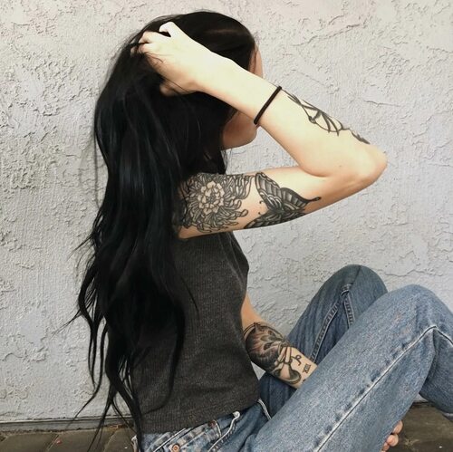 Графические татуировки основаны на абстрактных формах и линиях, создавая уникальные геометрические узоры и композиции. Они могут придать образу девушки с черными волосами современный и стильный вид.