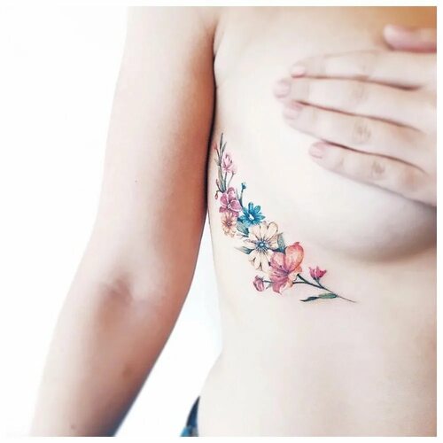 Цветочные мотивы - это классика в мире татуировок, и они также отлично смотрятся под грудиной сбоку. Вы можете выбрать цветок, который имеет особое значение для вас, или просто выбрать тот, который вам нравится визуально. Цветочные татуировки под грудиной сбоку могут быть нежными и женственными, добавляя романтичности в ваш образ.