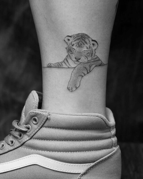 Простой и элегантный, одиночный тигренок может быть изображен в разных позах - играющего, спящего или просто прогуливающегося. Этот дизайн прекрасно подходит для тех, кто ищет символ силы и независимости.