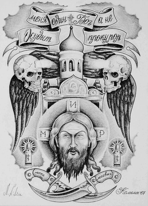 Огромная зоновская татуировка, покрывающая спину и плечи, изображает заключенного, сидящего в тюремной камере. Детализация и тенировка делают эту татуировку впечатляющей и мощной.