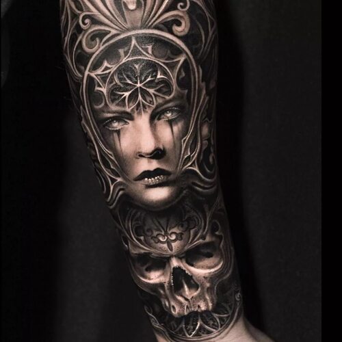 Создайте впечатляющий образ с помощью полного рукавного татуирования, включающего черепы, розы, пауки и другие готические элементы.