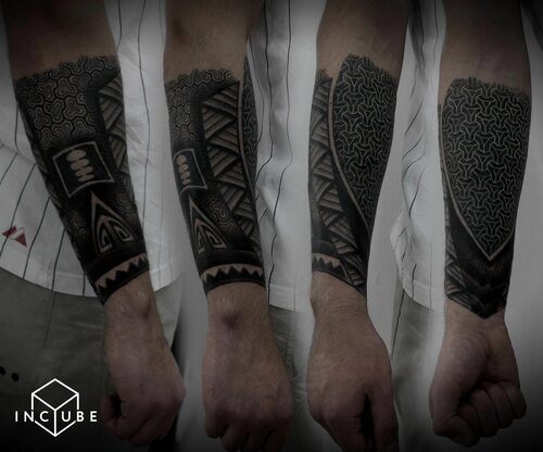 Блэкворк - это стиль татуировки, который представляет из себя использование исключительно черной краски для создания дизайна. Основной акцент делается на геометрических формах, линиях, штриховке и заполнении пространства. Черные мотивы и узоры в этом стиле могут быть очень разнообразными - от абстрактных геометрических форм до тонких и сложных орнаментов.