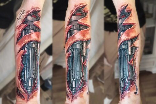 Биомеханика - это стиль татуировки, который воспроизводит нервную, мышечную и костную системы человека, а также механизмы и механические детали, взятые из мира техники и робототехники. Он стремится создать иллюзию того, что под кожей человека находится совершенно иной организм, состоящий из механических и электронных компонентов.