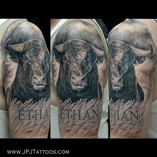 Татуировка быка в стиле реализма создает очень живописное и реалистичное изображение. Каждая деталь быка проработана с высокой степенью детализации, что позволяет создать впечатляющий 3D-эффект. Реалистический стиль подходит для тех, кто ищет выразительную и правдоподобную татуировку.