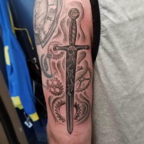 В классическом стиле татуировки меча на плече используются детализированные линии, темные тени и реалистичные оттенки. Этот стиль подчеркивает историческую значимость и символику меча, создавая эффектное и запоминающееся изображение.