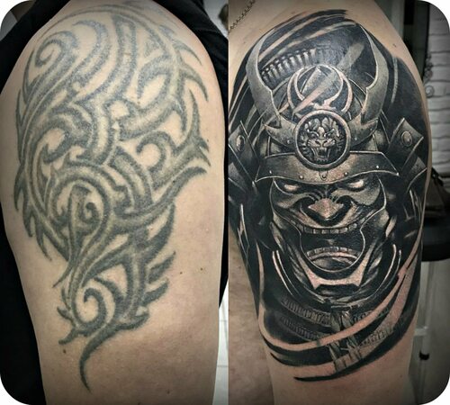 Татуировщик может использовать различные методы, чтобы достичь желаемого результата. Он может использовать технику перекрытия, когда новая татуировка полностью закрывает старую, или технику интеграции, когда новый дизайн вписывается в старую татуировку и создаёт из неё часть более сложного и интересного рисунка.