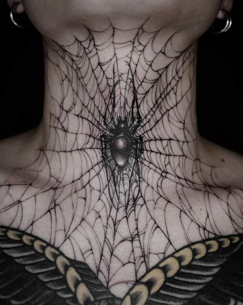 Наколка в виде паутины на задней части шеи может быть очень элегантной и сексуальной. Это место подходит для более утонченных и тонких дизайнов, которые добавят загадочности и очарования вашему образу.