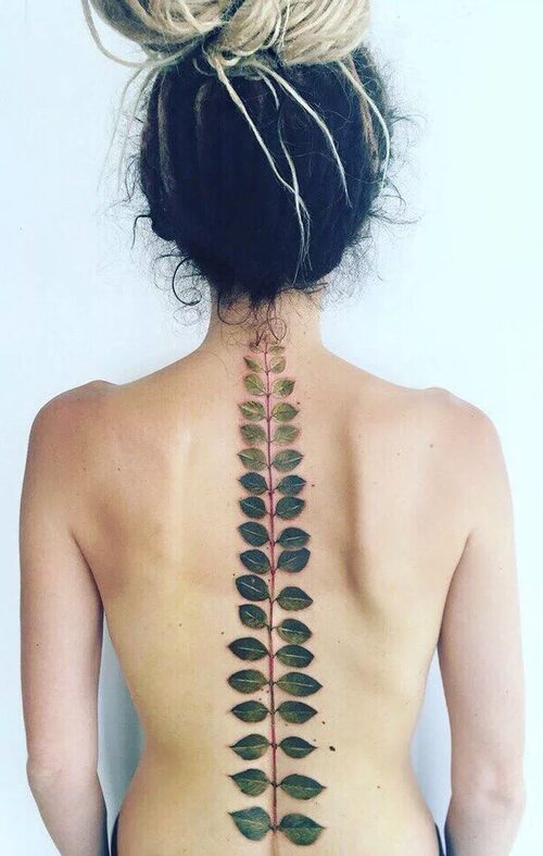 Цветочные мотивы всегда были популярными для татуировок и на позвоночнике они выглядят особенно элегантно. Разнообразные цветы, ветви и листья, расположенные вдоль позвоночника, создают нежный и женственный образ.