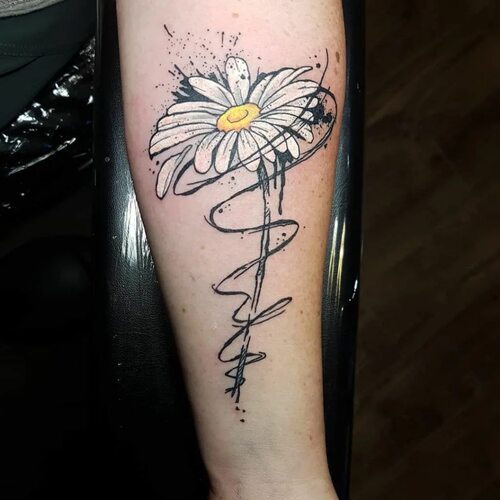Ромашка является прекрасным объектом для цветных татуировок. Вы можете добавить яркие и насыщенные оттенки, чтобы подчеркнуть красоту этого цветка.