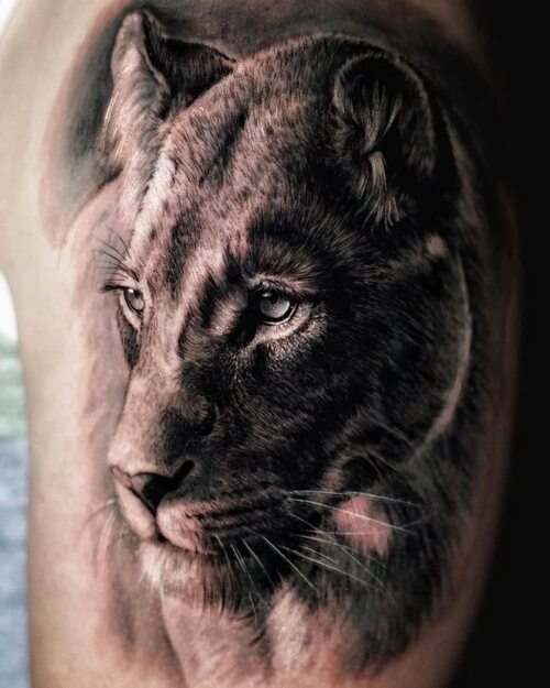 Татуировки львицы в стиле реализма создают эффект прямого изображения львицы на коже. Используя тонкие линии и детализацию, художник создает реалистичное и живое изображение львицы, выделяя каждый ее шершавый клочок и мускулы.