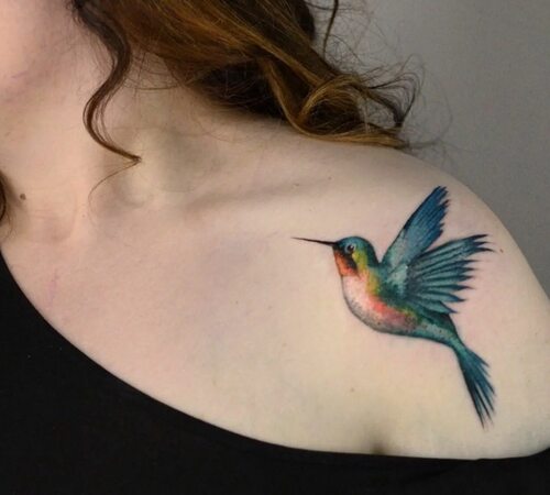 На третьей фотографии представлена татуировка колибри с использованием цвета. Яркие оттенки перьев придают татуировке живость и яркость.